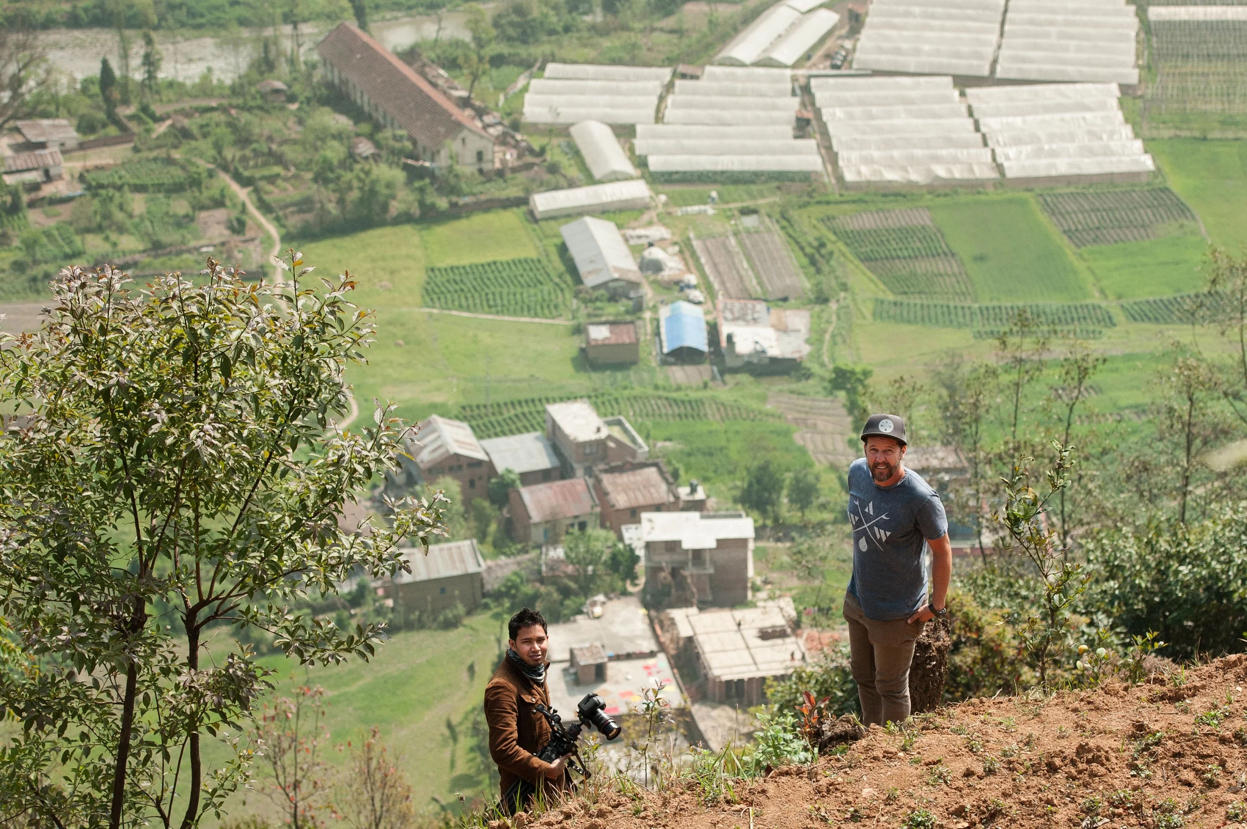 Bikash Pariyar (L) from Nepal and Dathan Graham (R) work together to document Khokana Leper Colony from above.